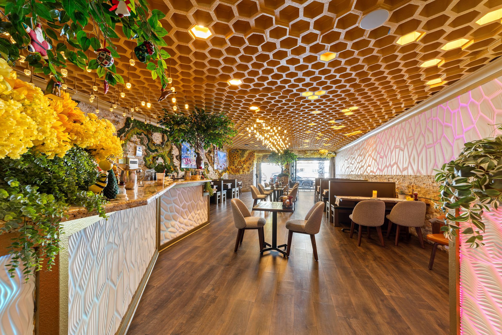 Join us for elevated brunch in the heart of Pacific Beach, where coastal ease meets golden refinement. Sunlight pours through honeycomb details as warm textures create an atmosphere that gently buzzes with life.